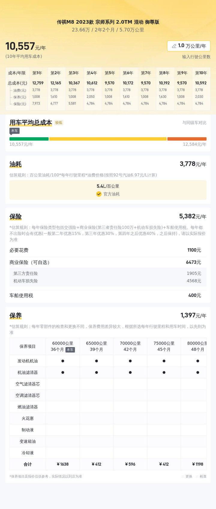 据估算,同级车的最低用车成本是10335元/年,最高是16976元/年,传祺M8 2023款 宗师系列 2.0TM 混动 御尊版是11135元/年,所以较低。