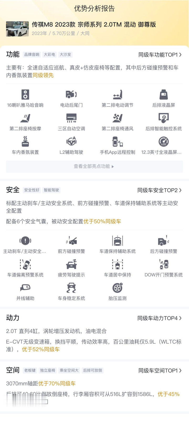 毕竟是2023款的车,所以配置很顶。传祺M8 2023款 宗师系列 2.0TM 混动 御尊版配备了全速自适应巡航、Nappa真皮座椅、第二排座椅通风加热按摩、手机无线充电、L2辅助驾驶、儿童座椅接口等配置。安全配置上,标配主动刹车/主动安全系统、前方碰撞预警、车道保持辅助系统等主动安全配置,配备6个安全气囊,被动安全配置优于68%同级车。